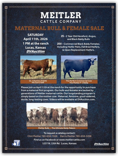 We would like to invite you to join us April 11, 2026 Auction at 1:00 pm at the ranch for our annual Meitler Maternal Bull and Female Sale. We would like to thank our long-time customers for their belief in our program. To those that may be finding us for the first time, we thank you for your interest and hope you like what you see.